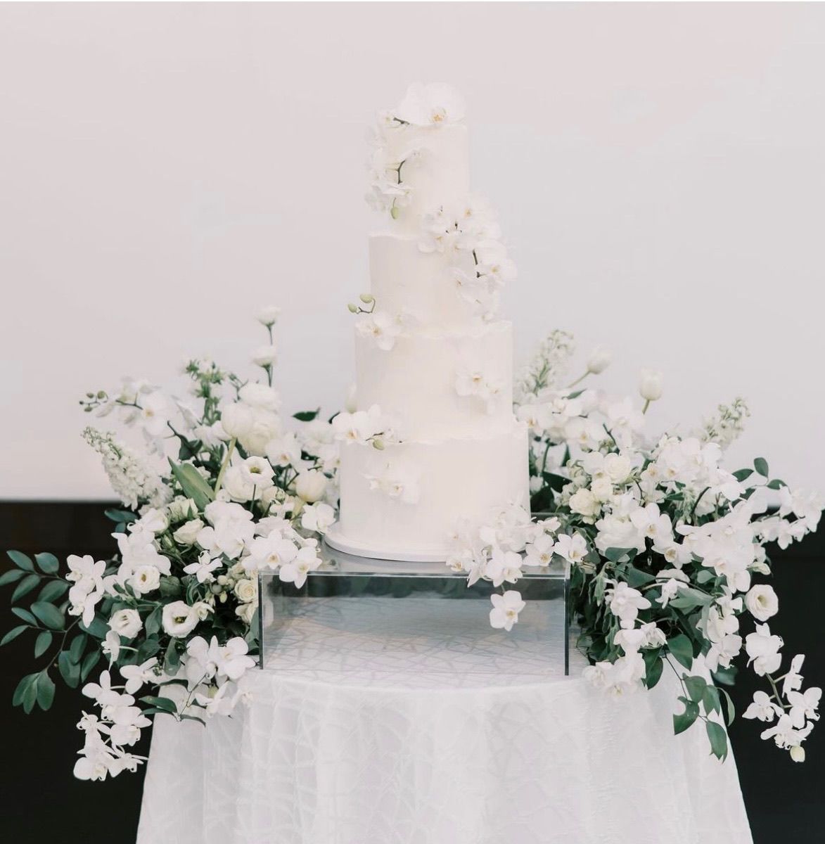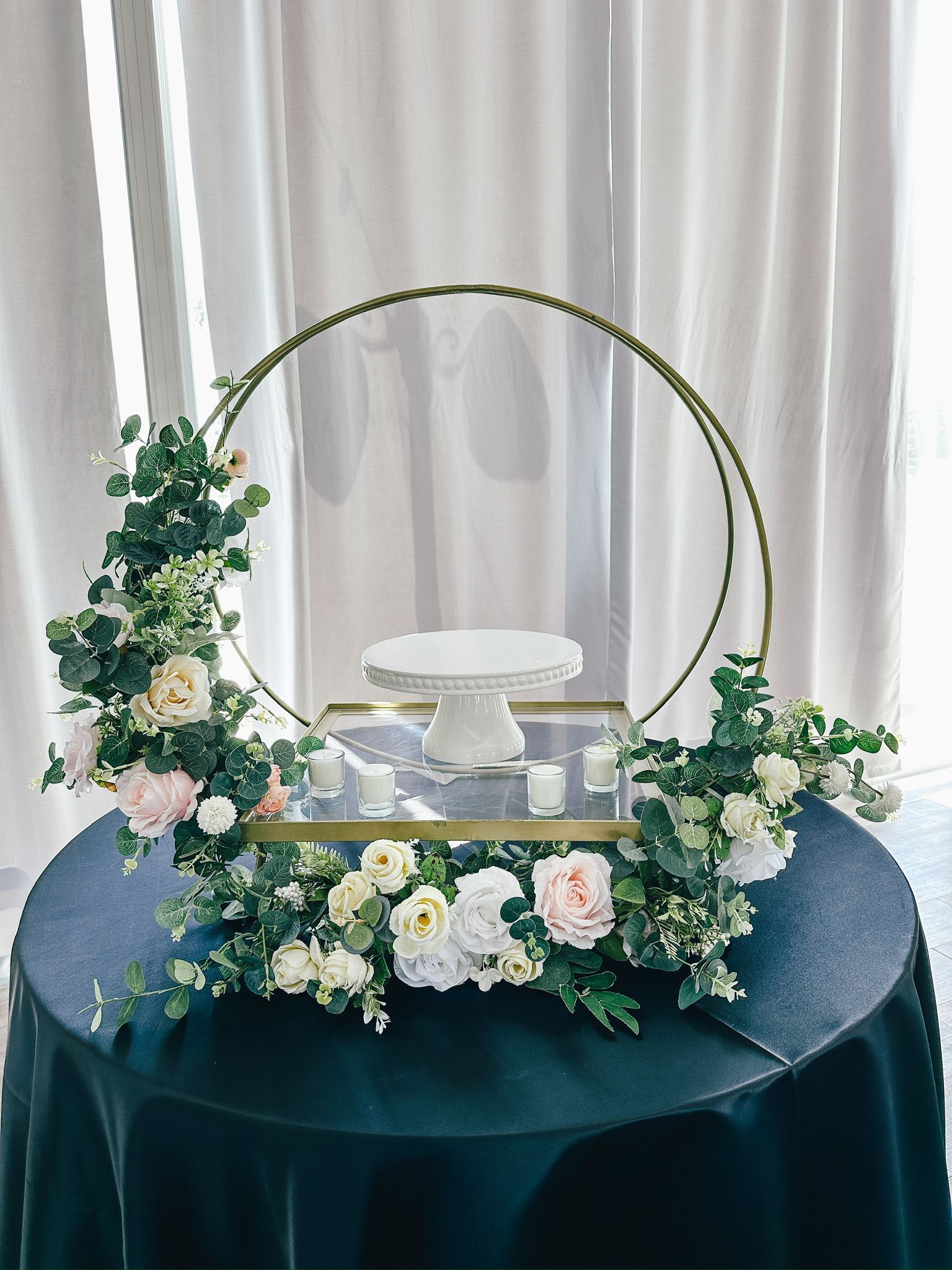 Elevate your wedding reception with our custom cake table design service, tailored to create a breathtaking centerpiece for your special day. We provide a 36“ table with a sleek glass top to give your cake a luxurious display. The table is dressed in specialty linen to match your theme, and adorned with lush florals, candles, and specialized decor that add elegance and charm. Whether your style is classic, modern, or whimsical, our carefully curated design will highlight your cake beautifully, creating an unforgettable focal point that enhances your celebration.